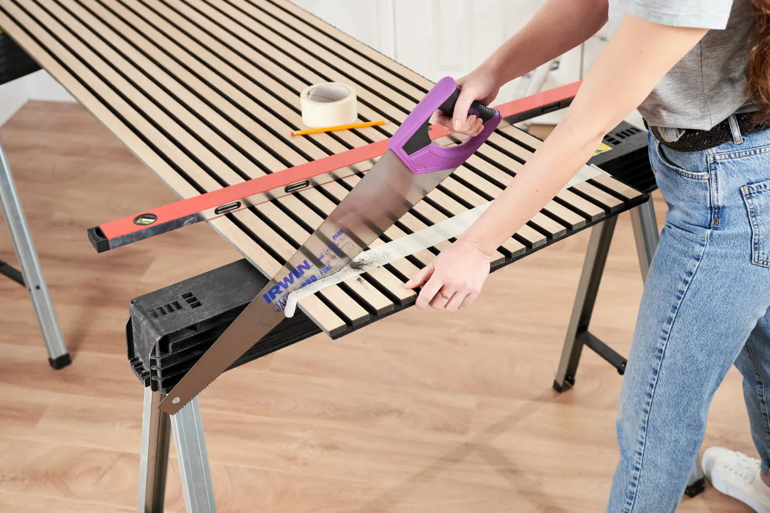 Cut along the marked line using a sharp, fine-toothed saw for the cleanest result. A track saw or circular saw works well for straight cuts, while a hand saw can also be used with care. For lengthways cuts, the felt backing can be trimmed with a sharp utility knife.