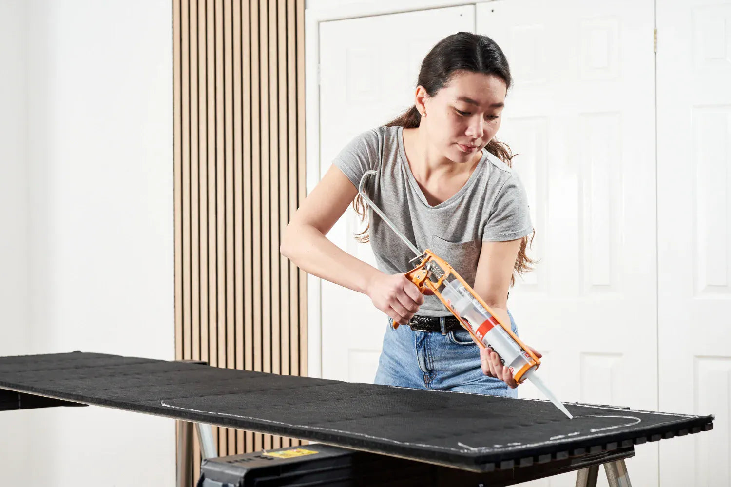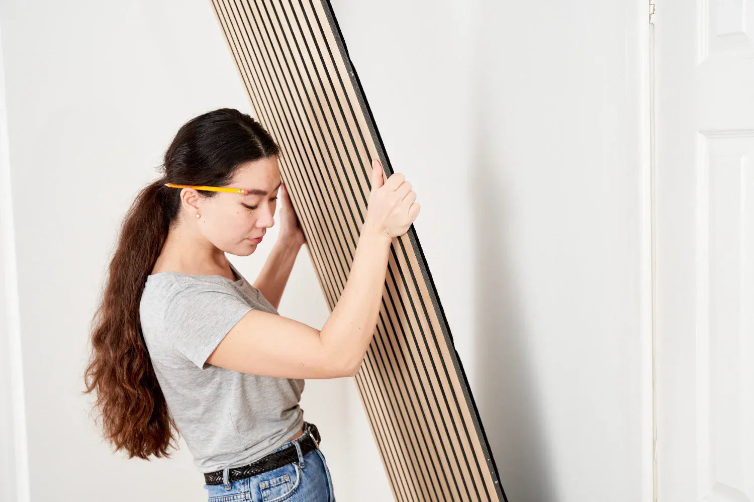 Secure panels by screwing through the felt backing between the slats and into the drywall. Use four screws per side, evenly spaced to keep fixings discreet. Matte black screws blend into the felt for a clean finish.